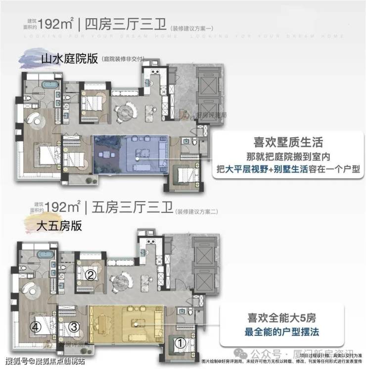 最后,建面约192㎡五房,在客厅中引进山水庭院(庭院装修非交付),呈现出空中别墅的生活氛围,此外,南向约18.5米四开间,南北四大对流,约40㎡星级主卧,带有独立卧私厅,衣帽间,独立卫浴等,还配置了约11米极致飘窗,好比自带广角的巨幕影屏,该户型还可定制为四房南向书房版,营造高雅生活。