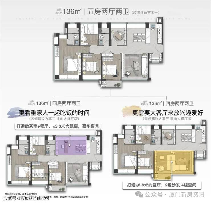 建面约136㎡颠覆性五房,整体空间综合使用率高达约87%!