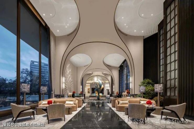 作为空间的迎宾序章,接待大堂注重仪式感,地面铺设着精致巧夺天工的拼花图案,犹如一幅动态的画卷,渐次引领宾客的目光。细腻的花纹与光影错落交织,营造出一种宁静而尊贵的气氛,每一步行走都仿佛是在历史长河中留下的深刻足迹。