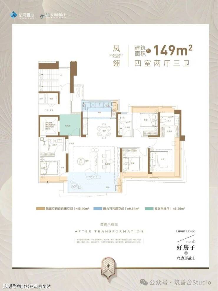 建筑面积约149平方米的大四房户型,坐拥超过16米的南向四开间广阔面宽,搭配落地超宽屏,带来极致采光,使空间更加开阔明亮;超过30平方米的LDKB大方厅,打造灵活多变的使用空间,促进家庭成员间的亲密互动;双套房设计,既保持独立又实现代际共融,满足和谐共居的需求;秉持“主卧小家化”的高级生活理念,近30平方米的主卧空间,享受媲美行政套房的尊贵体验。