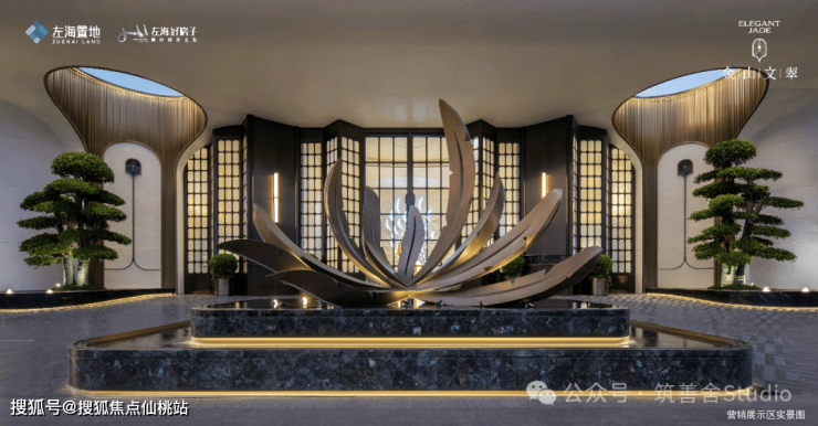 迎宾水景中的“百鸟朝凤”纯铜雕塑,以马达加斯加蓝翡翠奢石为底座,细节之处如门把手的凤翎纹绿奢石镶嵌,无不彰显其用心之深。