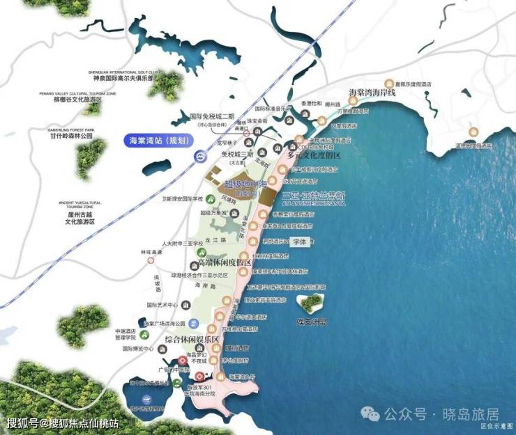 ◎通达交通属性——距离海岸线约 2 公里,距离海南环岛高速路约 4 公里,通往高铁站及机场都十分便利,未来还规划了海棠湾高铁站,建成后出行更加便利。