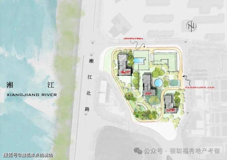 充分利用湘江西侧一线江景,以及南向低层建筑群及城市公园景观。以景观最大化原则,充分利用其区位的景观资源。极致规划,打造每户均有优势江景,更让每一位业主都能拥有超广角的江景视野,将 200 米宽的湘江江面、对岸滨江金融 CBD 的繁华天际线以及渔人码头的璀璨灯火尽收眼底。建筑布局经过精密计算,通过错落有致的楼栋分布,减少楼体间遮挡,让更多住户能无碍地欣赏江景。 为将每座塔楼沿江景观资源最大化,规划设计将建筑体量分解为3座高层住宅。所有建筑均沿湘江而生,铺陈开来。
