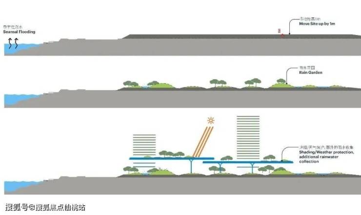 将地面空间开放给行人、绿植,不仅能美化环境,还能很好的应对气候环境所带来的洪涝挑战。(如上图)