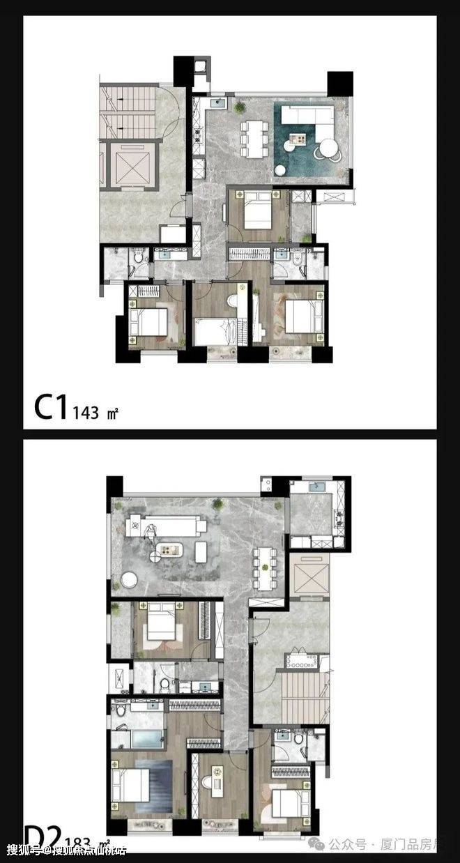 海沧中心TOD一种是两梯四户设计,边套是128平和131平户型,中间套100平户型,另一种是两梯两户设计,143平和183平户型,183平户型可以看作是143平的plus版本,尺度更大且多出一个卫生间。