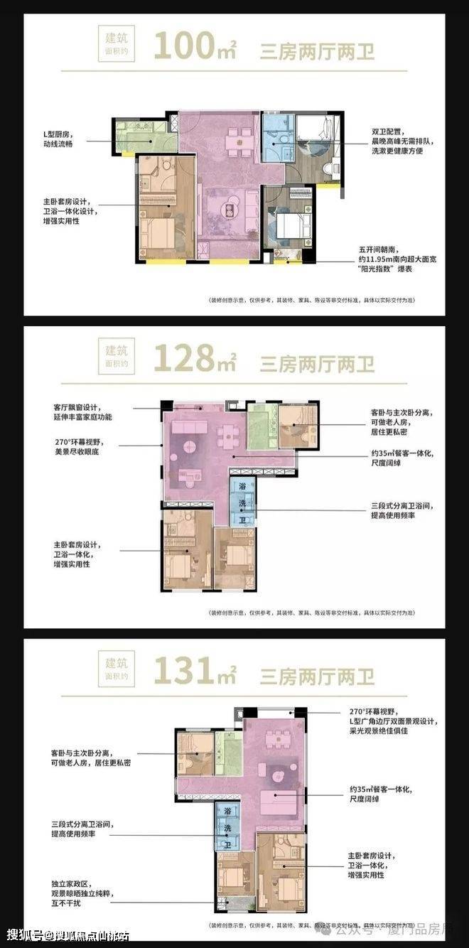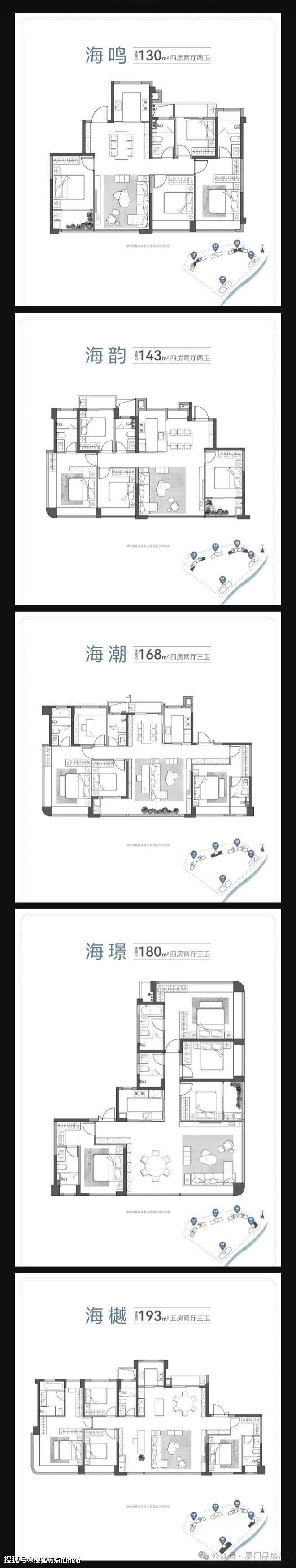 由于南侧还有地块遮挡,不是一线海景,所以边套和大户型都设计成了北厅不是传统南厅,斜向看海沧湖景观,部分客户可能会介意。100平的中间套基本没有景观,厅面宽3.5米居住尺度较小,公卫要靠过道采光通风。128和131平可以改造成小4房,但是入户门就是房间的设计让人感觉很突兀。143和183平的设计较好,动静分明和景观大横厅。