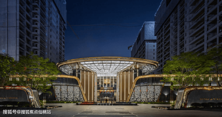 重金奢造酒店式环岛大门,以挑高星空顶、无风雨归家动线设计,让“低调奢华”尽显其中。11米金线挑高,对称排列镶嵌,呈现理性优雅的秩序空间。10米外延悬挑飘板,富有昭示性的圆弧造型,塑造流动舒展的隐奢韵律。