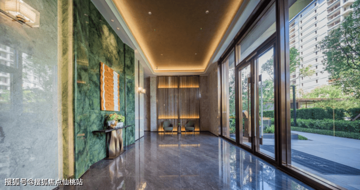 地上+地下双精装艺术大堂。墙面、地面大面积高端石材运用,搭配高品质金属材料,塑造内敛隐奢的迎宾氛围。1楼入户大堂打造约5.3米挑高空间,独家定制奢石「隐山碧」打造通高景墙,水墨质感纹理曼妙流动,如同一幅隐匿的国画艺术品。