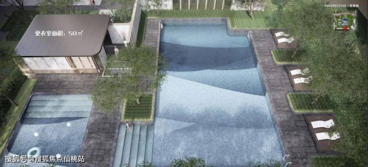 2️⃣景观泳池——室外度假泳池:450㎡成人泳池+70㎡儿童泳池,以植被环绕,设置独立更衣室,保障私密性同时兼顾功能性;增设休闲躺椅,提供多元社区休闲交流空间。