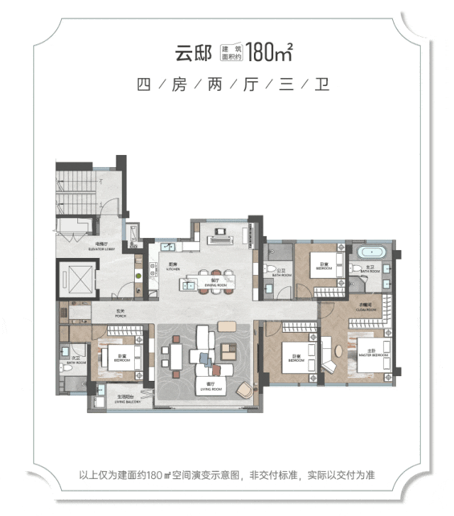 建面约180m²IMAX巨幕大宅,实现约96%空间使用率(以6#01单元,含电梯厅),比肩200m²+户型的居住体验,相当于让住宅多出一个房间的面积,带来更阔绰的生活尺度;约7m²独立入户前厅,保障出行的私密,同时延展家庭收纳空间;约3.1m墅质层高,纵向延伸空间的尺度,感知更开阔的生活场景;双南向套房格局,双主卧均带独立卫浴、衣帽间,满足家庭成员舒适与居家仪式感。