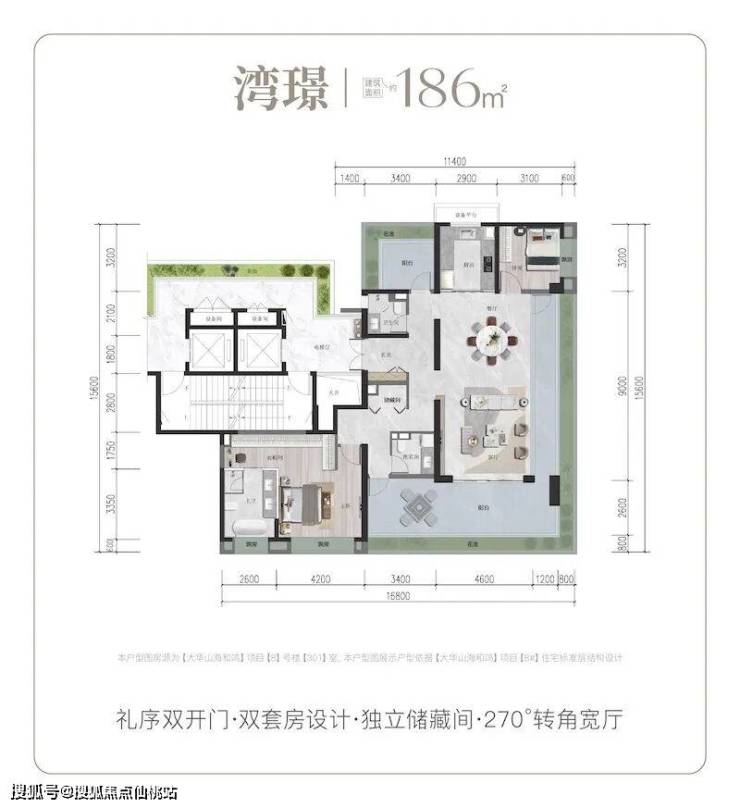 建面186㎡湾璟户型:礼序双开门设计,双套房布局搭配独立储藏间,270°转角宽厅尽显奢阔,满足高端旅居需求。