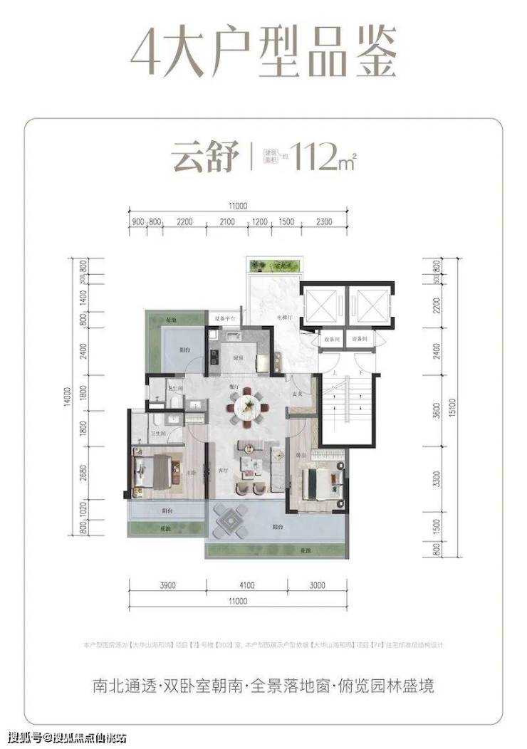 建面112㎡云舒户型:南北通透,双卧室朝南搭配全景落地窗,俯览园林盛境,空间利用率高,适合三口之家旅居。