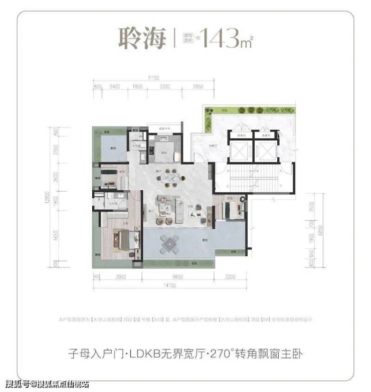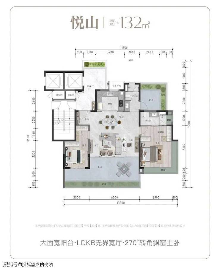 建面132㎡悦山户型:LDKB无界宽厅设计,大面宽阳台延伸生活空间,主卧270°转角飘窗,最大化吸纳山海景观。