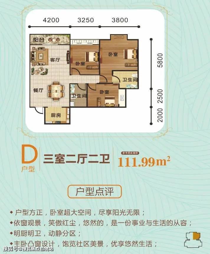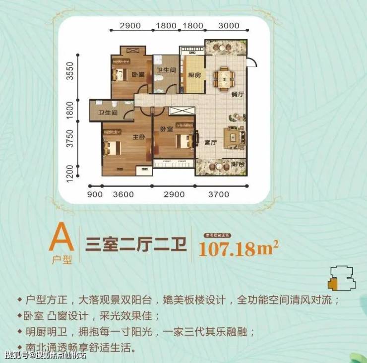 5号楼A户型:户型方正,观景双阳台,卧室凸窗设计,采光效果佳。一家三代其乐融融!