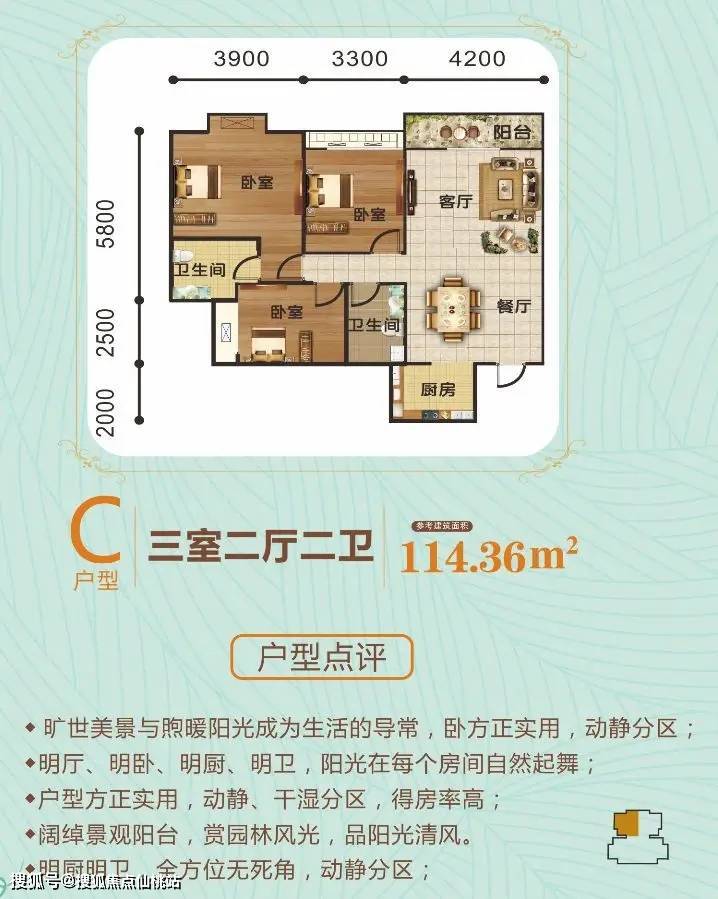 5号楼C户型:明厅,卧室,明厨,明卫,阳光在每个房间自然起舞。