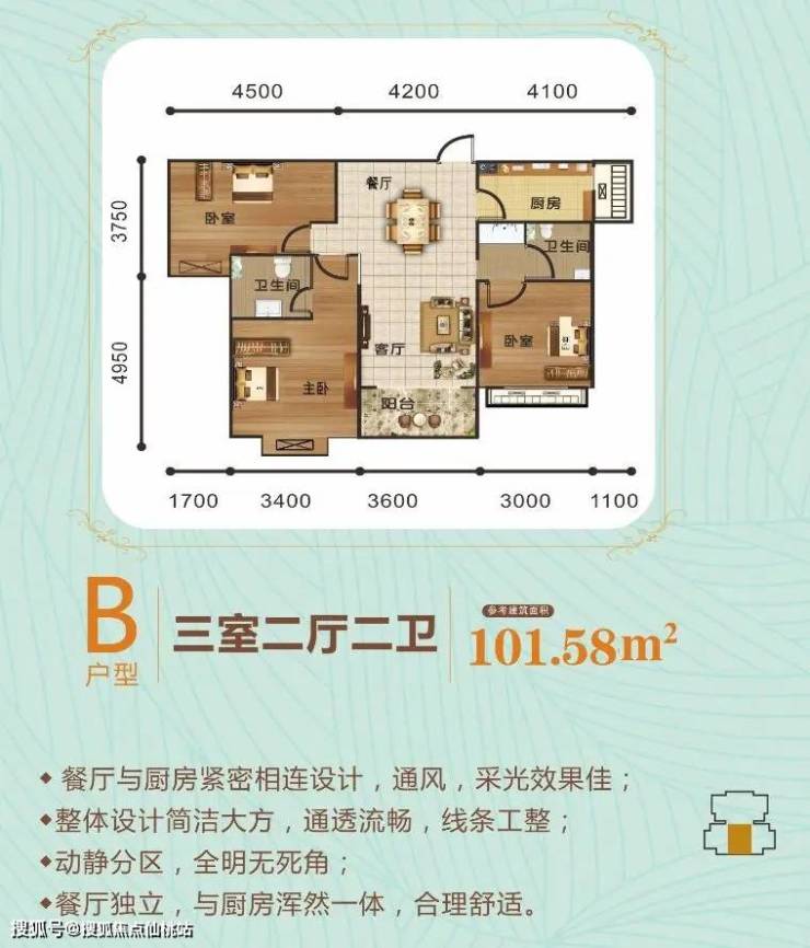 5号楼B户型:动静分区,全明无死角,餐厅与厨房浑然一体,合理舒适。