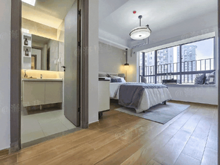 主卧做成套房设计,带有独立的卫浴,保持主人的独立与隐私性,南向飘窗引入满室阳光,可坐可卧,甚至可以打造成主任专属的阅读角或发呆区。