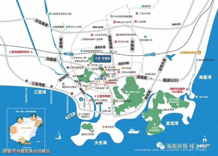 “全省规模最大的三亚市妇幼保健院”距离项目约500米;三亚市人民医院、农垦医院、三亚市中医院等“三甲医院”以及解放军425医院,解放军301医院。