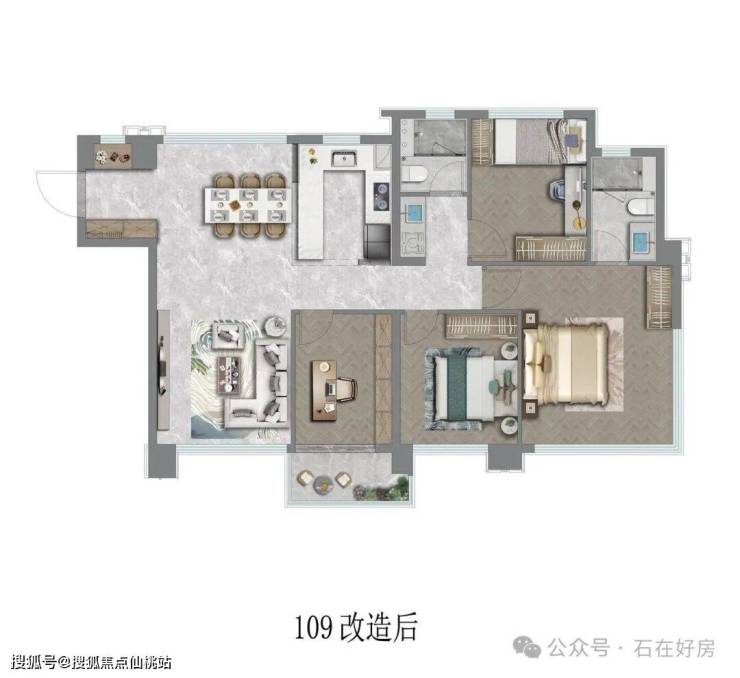 • 99㎡3+1房两卫(边套):首改家庭的理想之选,南北通透设计搭配四面采光,空气对流无死角。270°全景主卧与餐厅,拓宽观景视野的同时让采光更均匀,灵动的“3+1”空间可按需改造为书房、儿童房,得房率约92%,兼顾实用性与成长性。