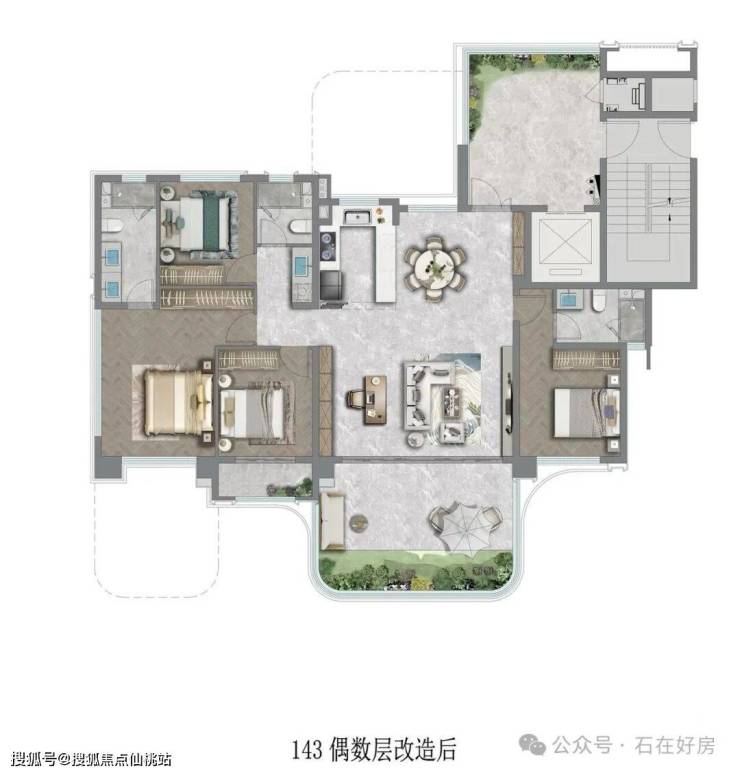 • 143㎡4+1房三卫(边套):改善终极之选,6m超大客厅面宽搭配全景视野,彰显人生格局。综合使用率118%-120%,最大赠送约62㎡,使用面积堪比200㎡大平层,“4+1”可变空间与双套房设计,既能满足家庭聚会的热闹场景,也能保障长辈与子女的独立生活,高赠送带来的“负公摊”优势,让每一分置业成本都物超所值。