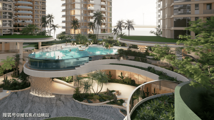 以超前手法打造约320㎡无边际悬空泳池,通过流水叠瀑链接负一层会所,于此可举办落日派对、池边社交,生活场景由此无限延伸。