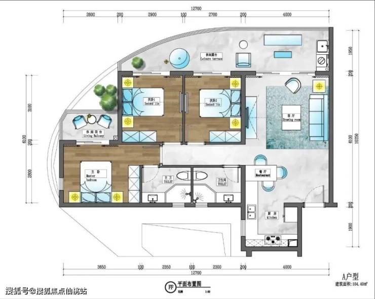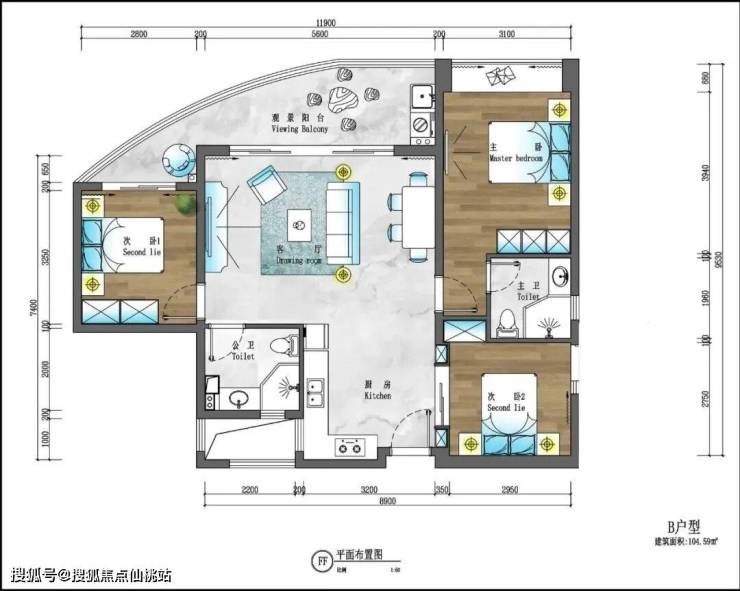 建筑面积104.4平方米,三室两厅两卫,全明设计,方正实用,功能区分合理,动静分离,会客休憩互不打扰,客厅及全部三个卧室都面向大海并与阳台相通,阳台长度达到少有的12.8米,极大的增强了业主在阳台上观海及休闲的体验度。客厅设计稳重大气,彰显待客之道。全明餐厅紧邻厨房,美味生活加速传递。主卧配备独立卫生间及双景独立花园阳台,尽显尊享,让您与轻柔海风一起绽放美好心情。