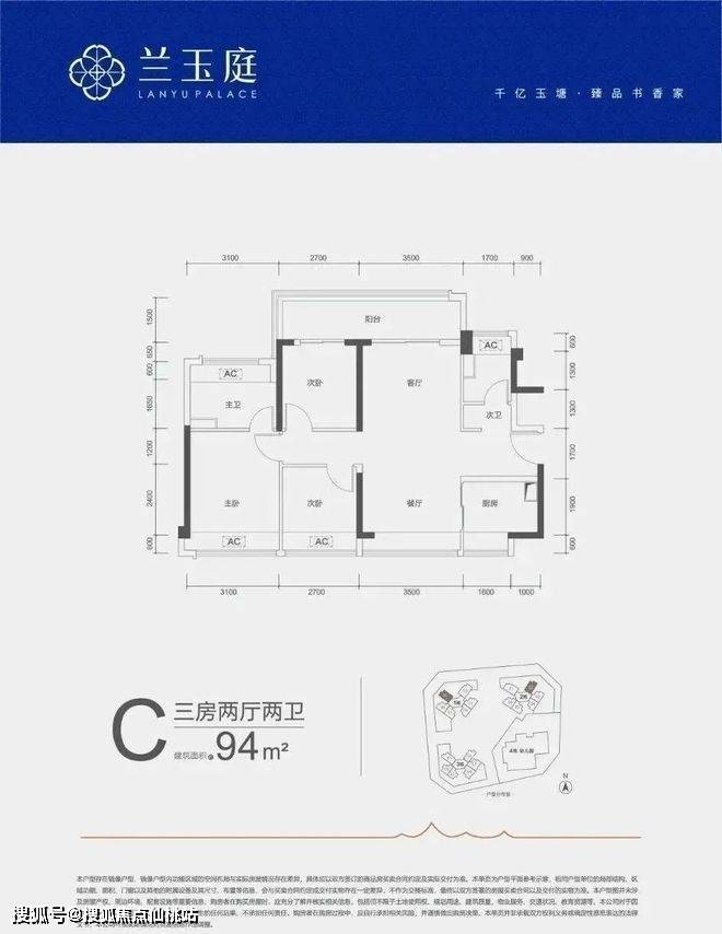 94㎡的3房2厅2卫,C户型,设计的是竖厅南北通透格局,客厅开间3.5米,3个卧室分别做到了3.1米/2.7米/2.7米的宽度,客厅连接次卧出6.2米长的大阳台,U型厨房,公卫三段式分离,得房率约79%(不含赠送),阳台主朝西北或东北向。