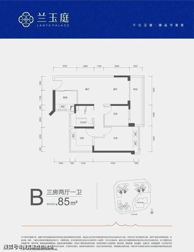 85㎡的3房2厅1卫,B户型,设计的是竖厅格局,客厅开间3.3米,LDKB一体化,三开间朝南,3个卧室分别做到了3米/2.7米/2.4米的宽度,客厅连接次卧出5.7米长的大阳台,L型厨房,创新式三分离卫生间,得房率约79%(不含赠送),西南或东南朝向。
