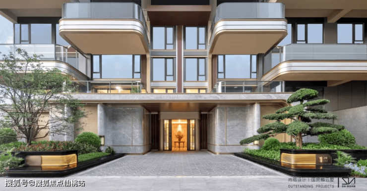我们在住区核心入口空间放大建筑尺度,通过高耸的墙柱和宽敞的顶盖创造公共建筑的尺度感与形式感。墙柱采用自然质感的爱马仕灰石材和闽南红陶板,与城市绿荫相融,为城市提供了有生机的停留空间。