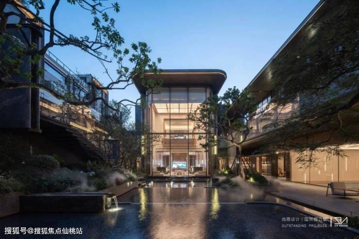 通过借势场地高差,我们建立了一个以约2000㎡下沉庭院、多功能魔盒、观景恒温泳池、风雨连廊和全区住宅首层架空层组成的完整、连续、边界模糊的空间体系,实现沉浸式“森境”体验。