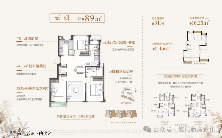 建发璞云凭借新规迭代+户型优化,户户约90%综合使用率,82-89平做到3房2卫,102-113平做到4房2卫,功能性和舒适性更强!