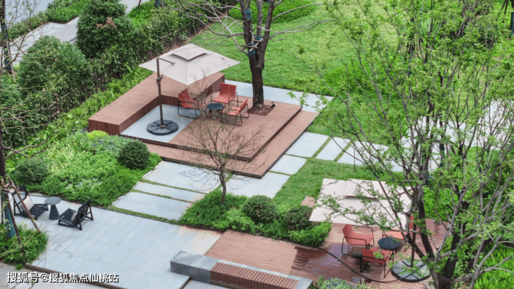 林下空间以绿色生态的自然骨架为支撑,融合树阵、景观座椅、对景景墙、木平台等,营造简约但不空洞的意境,是一处兼具气质与格调的私享秘境,多元化的配套设施,为业主提供了一处饶有情调的交流空间。