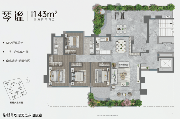 国贸天琴樾建面约143㎡户型,每层每户都配备南向空中花园,采用转角厅+空中花园的形式,让奇偶层空中花园始终围绕客厅核心功能展开,在露台设计上均衡户外户内关系,最大限度让出公共空间。打造挑高约6.1米的立体空中双露台,实现户户光线满分。