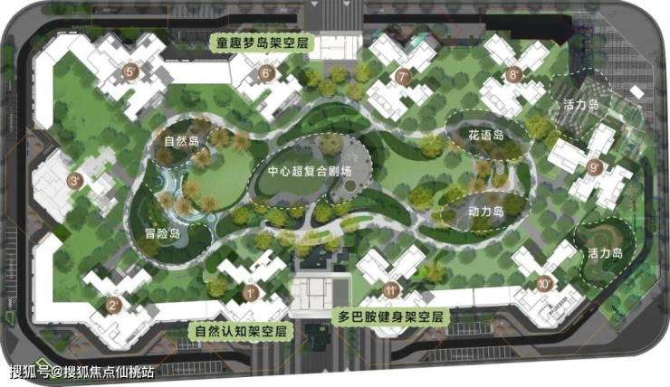 南宁未来城市社区在架空层营造上,充分考量全年龄段孩子的需求,针对0-18岁不同年龄段打造了童趣梦岛、自然认知、多巴胺健身3个主题成长空间,打造的儿童主题沉浸式体验空间,兼顾儿童锻炼、玩乐、看护、学习等功能。