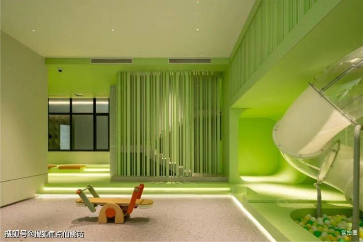 在6#楼,项目用整层架空层空间打造了一座“浮光森林”:治愈系绿调墙面及娱乐设施采用E0级环保涂料,中央空调恒温守护,冬暖夏凉,让孩子在22℃的清风中肆意奔跑。
