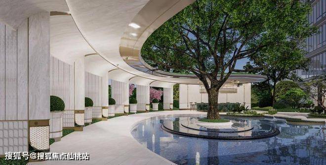 售楼部前场打造度假式前场园林(后期移交市政),大量水景搭配丰富绿植,约82米长、约12m高,环岛式落客,星级酒店般的体验,臻奢用材,运用多种奢石,打造封面级城市界面
