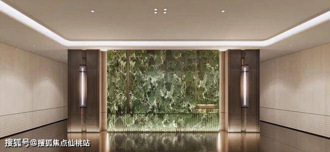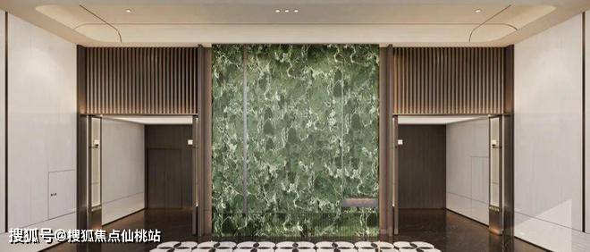 酒店式一体化美化设计,电梯门楣上方均用金属雕刻项目图腾,门牌:意大利大花绿岩板+氛围灯,彰显业主气质;电梯轿厢正面采用大版面意大利大花绿岩板,镜面金属吊顶,地面为定制墨染流云奢石嵌以金属logo,侧面配置了人脸识别的梯控面板,无触归家