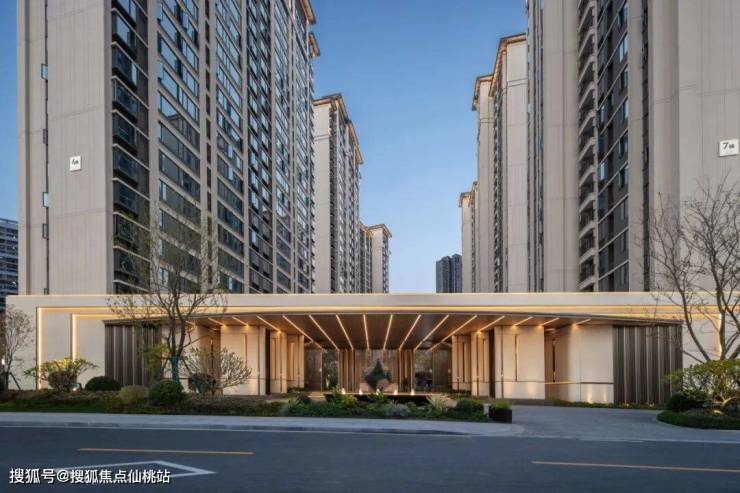 社区大门作为归家序列的起点,承载着项目形象展示、空间过渡及文化表达的多重功能。泉州保利隆恩·和光尘樾以简洁横向顶部及立体竖向支撑,塑造61米恢宏大气门庭。