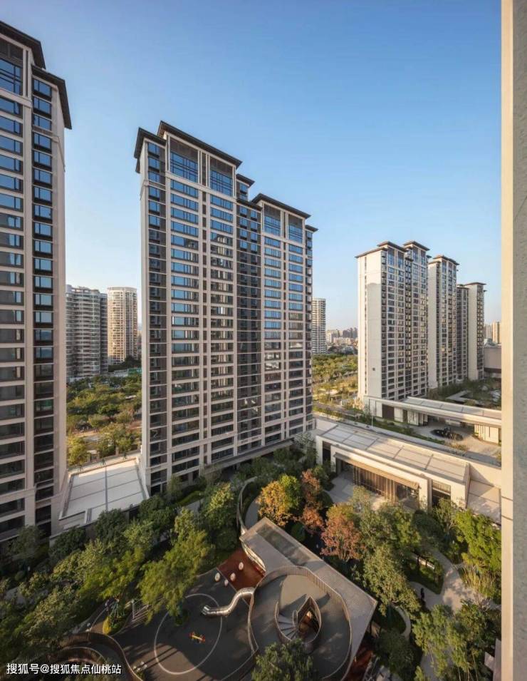 同时,立面通过精细化比例分割与进退关系处理,结合阳台、飘窗等功能构件,形成虚实相生的光影效果,兼顾私密性与开放感,呼应“和光尘樾”中“光”的意象。