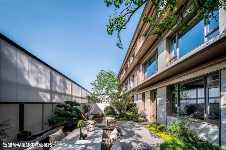 纯低密联排别墅区采用全蓝眼睛石材、铝板与Low-E玻璃组合立面,考究选材与现代设计手法相融合,呈现出雅致而不失奢华的东方宅院气质。别墅设计溯源传统东方建筑的符号特征与肌理,经由现代手法转译,突出深远出挑的檐口造型,强化横向线条的延展感。