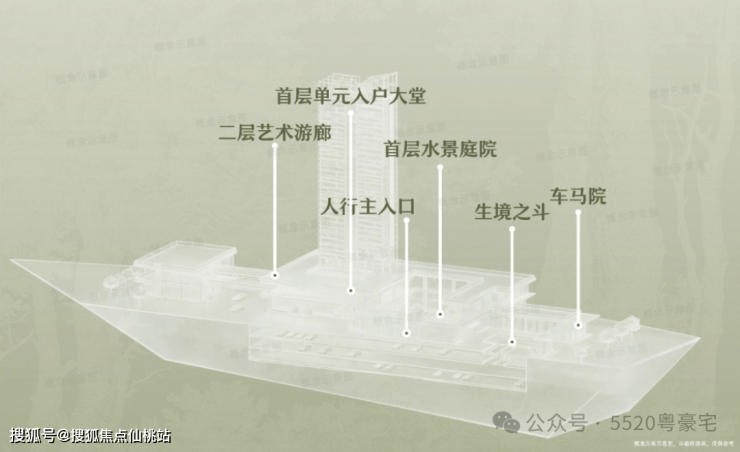 首层谧邸之厅:采用围合式庭院设计,阔绰车马院与酒店式落客区以从容礼序迎接归家,营造出私密而尊贵的入户体验。