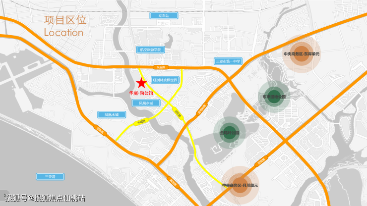 东接凤凰路,西接迎宾路,直达三亚繁华商圈,畅达机场高铁,多路公交及有轨电车途径。距离三亚高铁站1公里、车程约3分钟,距离距离G98高速入口火车站互通仅2公里,车程约5分钟,距离三亚国际凤,凰机场10公里,车程15分钟。