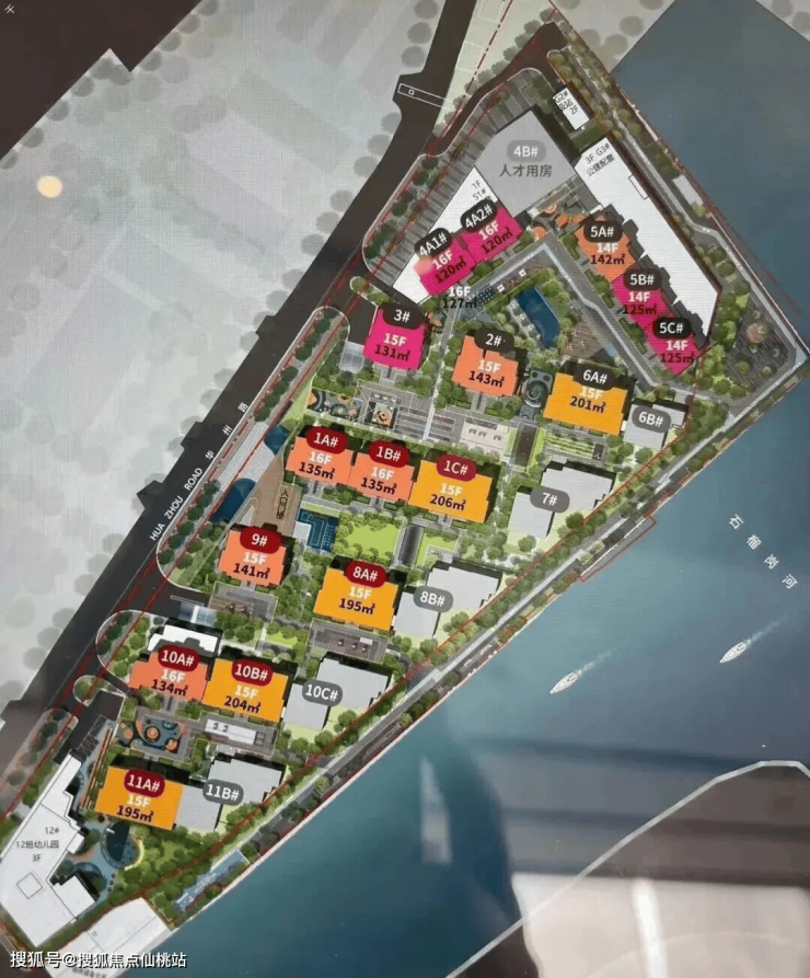 由于临近军区的原因,所以朝向不是正南,而是偏西南,小区设计南低北高,东侧的临河位置由于限高15米,做了5栋4层高叠墅,西侧也是小高层15-16层设计。