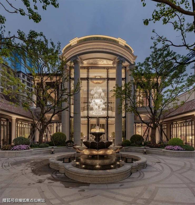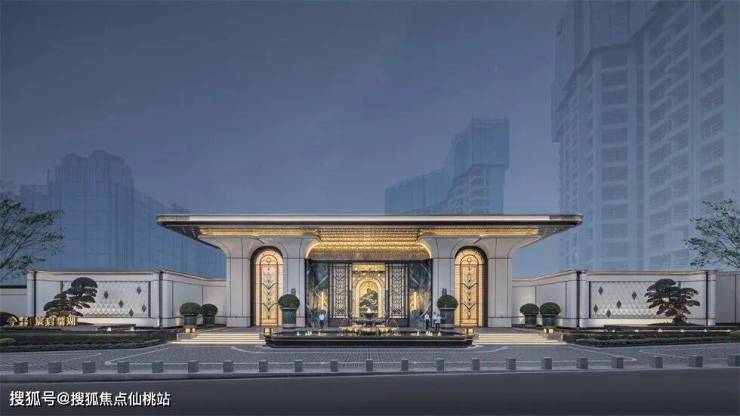 立面的柱头用灯光细致的勾勒,顺着弧线的转折画出建筑骨架,艺术玻璃呈现出柔和的内透,整体构成明亮却不喧嚣的光环境,让回家变成一种值得被期待的仪式。