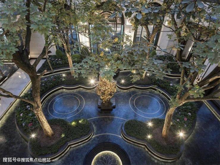 其次是传承典藏的厚重感。穿过前厅,视线就会被中轴的水景吸引。奢石与镜水占据在空间的核心位置,灯光藏在水岸,轻轻照亮雕塑和轮廓。乔木从水中拔地而起,为视觉语言增添了纵向的层次。温暖的低色温灯光,让蓝黑色的材质呈现出神秘内敛的温润质感,微风吹过水面,反射出细碎的光影。