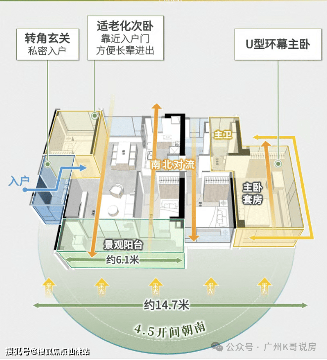 南向约14.7米、4.5个开间的布局,三面环幕,通透敞亮。