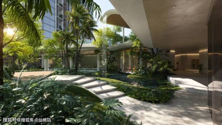 WTD纬图设计将中央庭院打造成一个可步入、可沉浸的“秘境雨林”。园林以“生息浮岛,秘境雨林”为理念,打造贯穿南北的“碧珀水轴”,串联碧珀叠溪、无界泳池、幽谷树屋等七重景观。7米高空中悬瀑垂落林间,会所隐于幽谷,营造沉浸式热带自然体验。