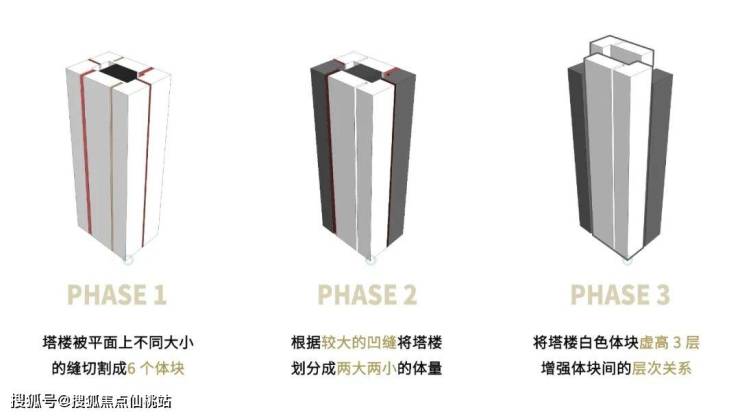 建筑师将塔楼拆分为多个体量,相互间的间隙被设计为共享平台,为中庭空间提供通风和采光。同时由于基础体量比例宽大,多体量规划将使塔楼各个体块的比例更为修长挺拔,形成错落的天际线。
