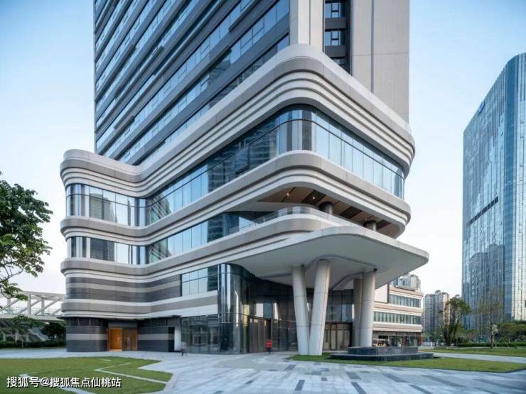 保利天际底层裙楼充分地敞开于户外,根据功能的需求使模仿自然沟壑的横向肌理外凸形成入口雨棚,内退形成休闲平台,从而形成丰富的立面形态,带来层叠的视觉观感和无遮挡的视觉体验。