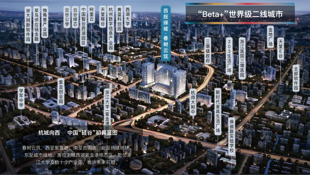 西投绿城·春树云筑,位于三墩北紫金港科技城,地处城西科创大走廊起点,“一廊三城”中紫金港科技城核芯,毗邻阿里云谷,紧邻浙大紫金港校区及西湖大学,聚集西湖科技园、紫金港众创小镇、独角兽产业聚集地、阿里巴巴大数据研发总部等十几个产业园,上千家企业,以人工智能、信息技术、生命科学、智能制造为重点发展方向。现有产业人口约35万,预计到2022年板块将引入约45家科研院,约400家高新技术企业,约50万产业人口。未来将成为高净值产业人口聚集区,投资潜力巨大。